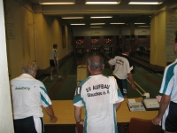 Ein Freundschaftskampf der etwas anderen Art fand am 10.06.2005 im Waldschlößchen statt. Stark ersatzgeschwächt, die Spfr. Teutloff und Voigländer fehlten (entschuldigt), konnten wir nicht wirklich was reißen, allerdings stellte der KSV Saxonia an diesem Abend die beiden besten Einzelkegler des Turniers, die alleinigst [M. Wohlgemuth 422 und F. Grubisch 416] die 400er Marke knacken konnten. |
