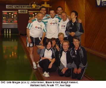 Zustande gekommen ist das Ganze aufgrund dessen, daß in dieser Damenmannschaft, die Buchhalterin unseres KSV Saxonia Spfr. und Hauptsponsors Hans-Ulrich Voigtländer kegelt, der mit seiner Firma WTE Präzisionstechnik auch eine Filiale in Kempten unterhält. Genug der Vorrede...da ja der Spaß vordergründlich war, konnte es auch keinen Abruch tun, daß die Unterthingauer Damen nur zu fünft anreisten, denn leider war die sechste Dame wegen Krankheit im Allgäu geblieben, so daß die sechste Spielerin durch den KSV Saxonia gestellt wurde. Und weil wir uns nicht Lumpen (...hat nix mit den Cranzahlern zu tun...) lassen, haben wir unseren derzeit besten Kegler (lt. Trainingsstatistik) als Schlußspieler(in) den Damen zur Verfügung gestellt.